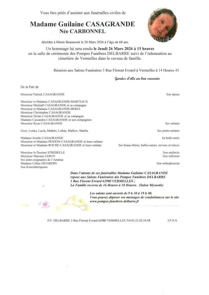 Madame Guilaine CASAGRANDE Née CARBONNEL Décédée à HENIN BEAUMONT le 20 mars 2026 à l’âge de 68 ans. 8 Commentaires Arnaud Morel sur 21 mars 2026 à 19 h 51 min Sincères condoléances à la famille , courage pour cette douloureuse épreuve Réponse Budynek Marie Françoise sur 21 mars 2026 à 20 h 47 min Je présente mes plus sincères condoléances à l’ ensemble de la famille Réponse Baert sur 24 mars 2026 à 18 h 35 min Sincères condoléances à toute la famille. Jean luc et sylvie Réponse Michel Hermand sur 29 mars 2026 à 13 h 19 min Sincères condoléances a toute la famille Réponse annick ribu sur 24 mars 2026 à 19 h 38 min sinceres condoleances a toute la famille annick ribu renuy Réponse Delannoy Quentin sur 25 mars 2026 à 21 h 36 min Sincère condoléances à toute la famille Quentin Delannoy Réponse Malaury sur 26 mars 2026 à 21 h 39 min Sincères condoléances à vous tous . Courage a toute la famille . Réponse Carlezoti Giovanny sur 26 mars 2026 à 21 h 47 min Sincères condoléances à toute la famille . Soyez fort dans cette épreuve difficile et soyez fiers de votre Maman et le papa peut être fier de son épouse Réponse Poster le commentaire Annuler la réponseVotre adresse e-mail ne sera pas publiée. Les champs obligatoires sont indiqués avec *Commentaire * Nom * E-mail * Site web