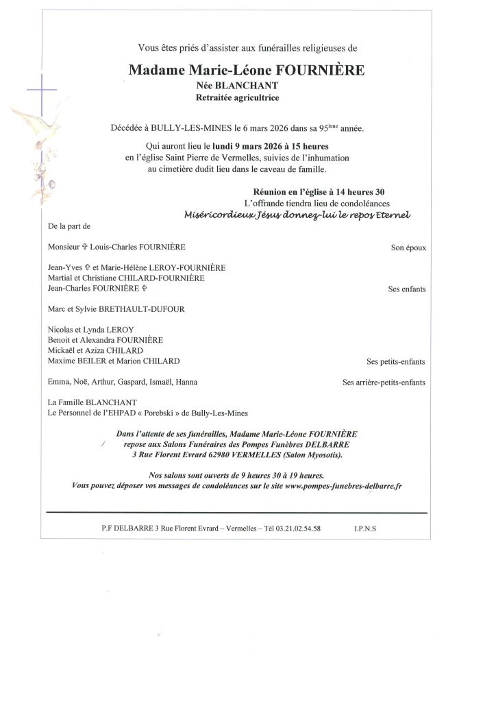 Madame Marie-Léone FOURNIERE Née BLANCHANT Décédée à BULLY-LES-MINES le 6 mars 2026 dans sa 95ème année. Poster le commentaire Annuler la réponseVotre adresse e-mail ne sera pas publiée. Les champs obligatoires sont indiqués avec *Commentaire * Nom * E-mail * Site web