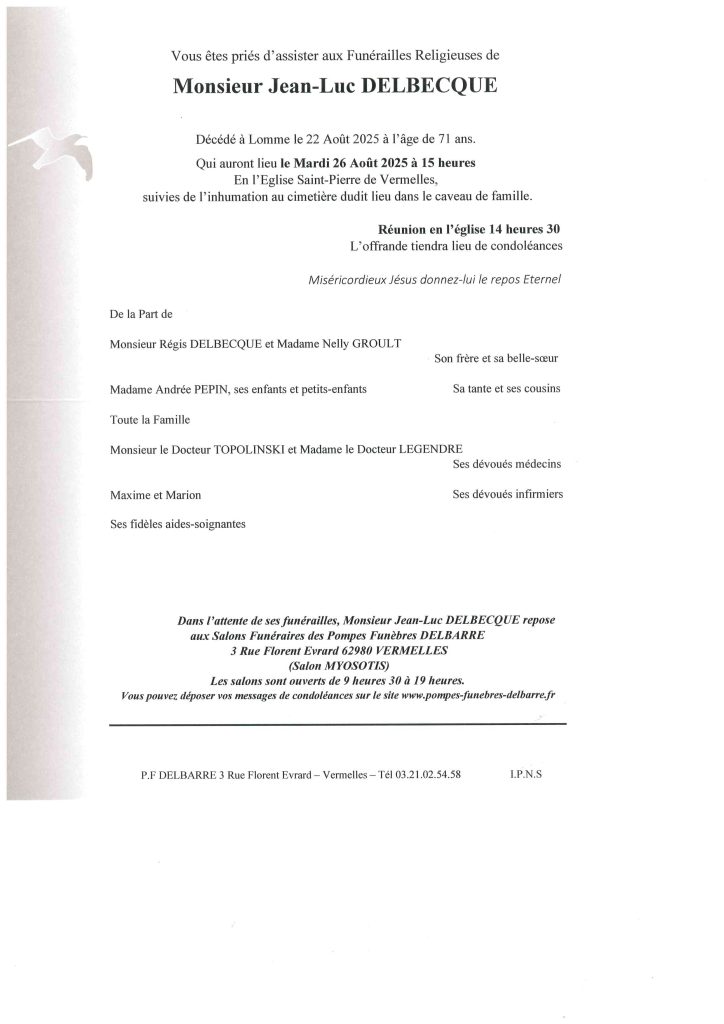 Monsieur Jean-Luc DELBECQUE Décédé à LOMME le 22 Août 2025 à l’âge de 71 ans. Poster le commentaire Annuler la réponseVotre adresse e-mail ne sera pas publiée. Les champs obligatoires sont indiqués avec *Commentaire * Nom * E-mail * Site web