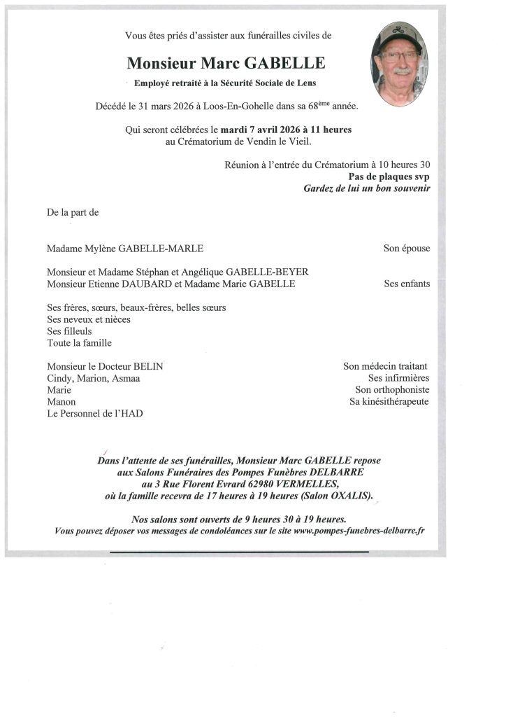 Monsieur Marc GABELLE Décédé à Loos-En-Gohelle le 31 mars 2026 dans sa 68ème année. 2 Commentaires Berth Nadine sur 2 avril 2026 à 10 h 41 min Sincères condoléances à toute la famille Bon courage pour cette épreuve Réponse Lydie Gorski sur 2 avril 2026 à 19 h 49 min Au revoir Marc ! De tout cœur avec vous dans cette épreuve. Condoléances. Réponse Poster le commentaire Annuler la réponseVotre adresse e-mail ne sera pas publiée. Les champs obligatoires sont indiqués avec *Commentaire * Nom * E-mail * Site web